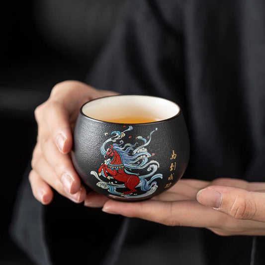 Year of the Horse "Success Upon Arrival" Chinese Art Tea Cup Set | 4-Piece Rustic Porcelain Zen Cups Gift Box for Elders, Corporate & Birthday Gifts
