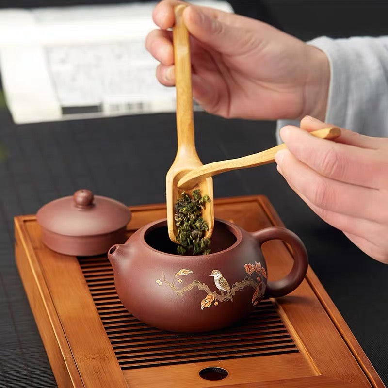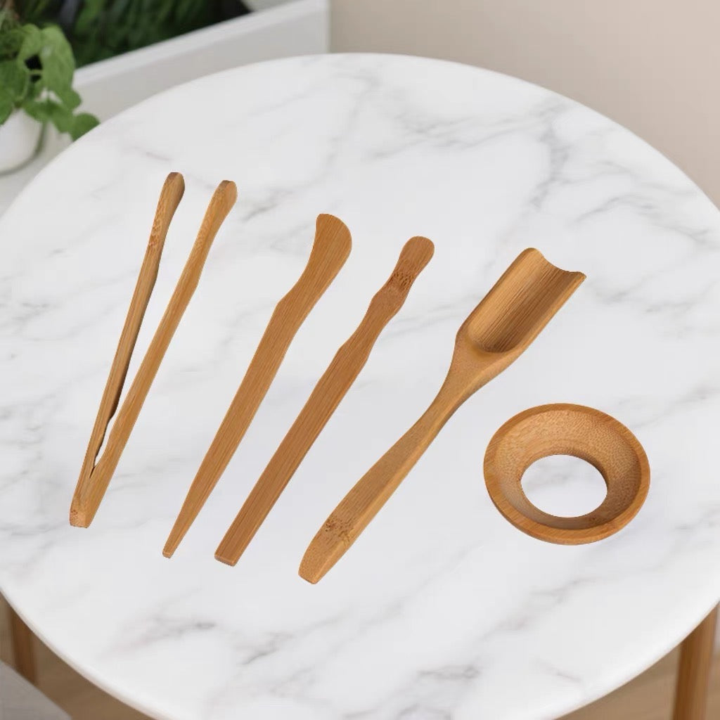 This traditional tea ceremony set includes six essential tools: Tea Scoop (for measuring loose leaf tea), Tea Needle (for clearing teapot spouts), Tea Brush (for cleaning), Tea Tweezers (for handling hot cups), Tea Spoon (for removing tea leaves), and Tray Brush (for maintaining your tea tray). All tools are crafted from sustainable natural bamboo.